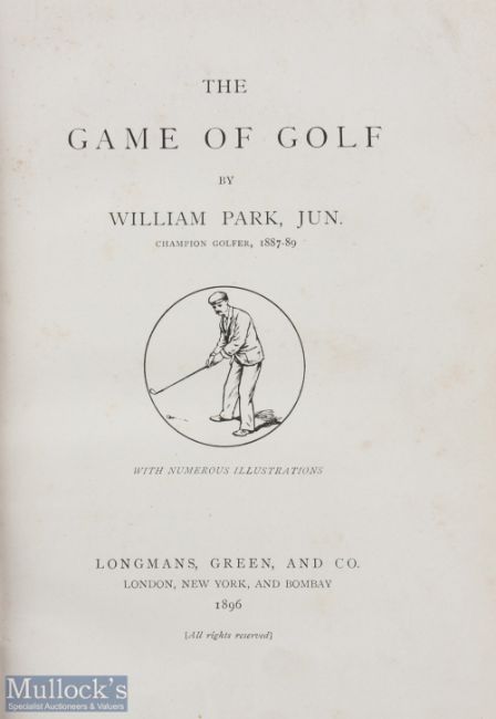 Park, W Jnr (Champion Golfer 1887-1889) - "The Game of Golf" 1st ed 1896 original decorative pictorial cloth boards and spine c/w "Mudie's Select Library" label laid down on the front board, numerous illustrations - corners bruised and spine faded, some stains to the back board, and pages ix to xii, and 1-2 have some minor moth damage to the very bottom of each page - otherwise generally clean internally (F/G). Note this was the first book authored by a golf professional, besides historical and instruction material it also contains important advice on construction and upkeep reflecting the diverse responsibilities of early professionals.