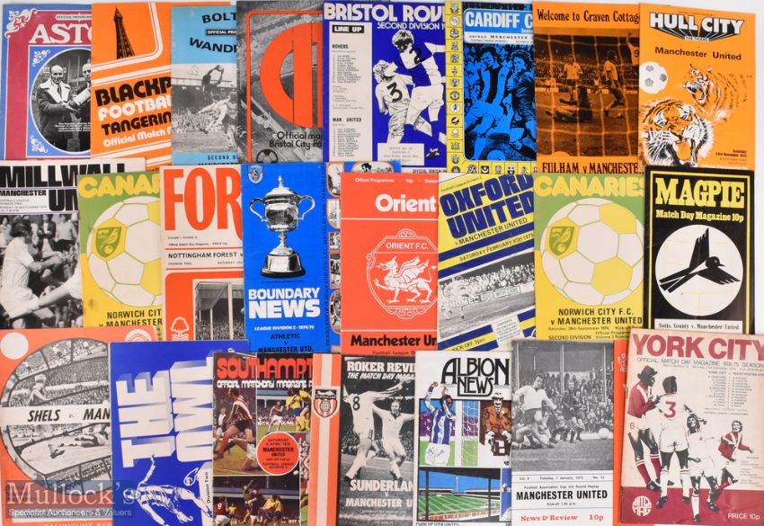 1974/75 Manchester Utd Div 2 away programmes Aston Villa, Blackpool, Bolton Wanderers, Bristol City, Bristol Rovers, Cardiff City, Fulham, Hull City, Millwall, Norwich City, Nottingham Forest, Oldham Athletic, Orient, Oxford Utd, Norwich City, Notts. County, Shelbourne (friendly), Sheffield Wednesday, Southampton, Sunderland, WBA, Walsall (FAC replay), York City; varied condition, generally fair. (23)