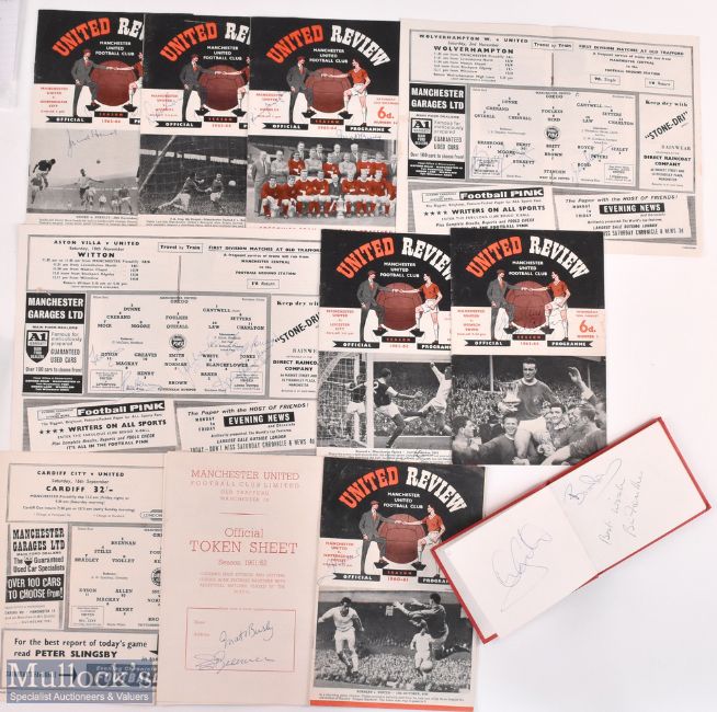 Collection of football memorabilia 1990s Red Devils autograph book with United player signatures; various Manchester Utd programmes (10) with player autographs Law, Herd, Busby, George Best and White, Jones, Blanchflower of Spurs + more; Manchester Utd reproduction of tickets, papers, programmes; a 1950s scrapbook (lacking covers) with loose pages full of player signatures (different clubs) of that era. (A Lot)