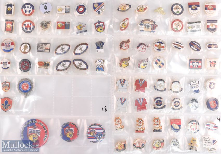 Assorted Rugby League enamel badge selection to incl Wakefield Trinity, Sheffield Eagles, Swinton, South Wales Scorpions, Trafford Borough etc, varying styles, shapes and sizes (#180)