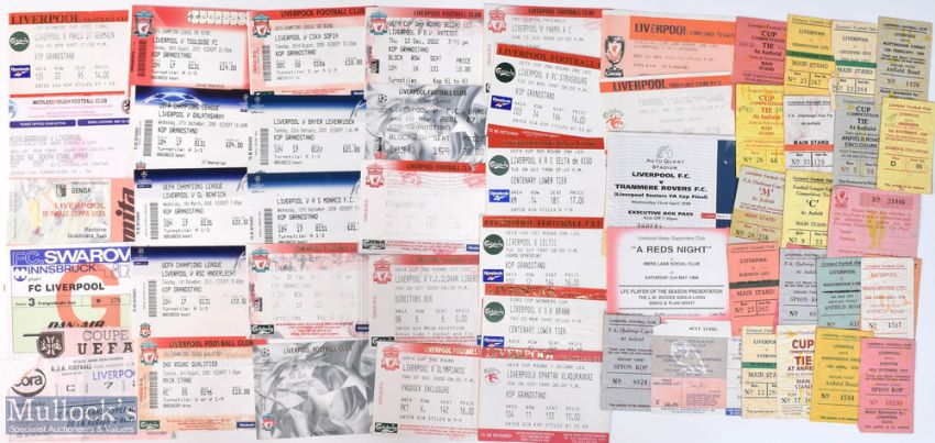TICKETS: Liverpool European match tickets homes 1991/92 Auxerre (UEFA), 1992/93 Apollon (ECWC), 1995/96 Spartak Vladikavkaz (UEFA), 1996/97 Brann (ECWC), 1996/97 Paris St. German (ECWC s/f) 1997/98 Celtic (UEFA), Strasbourg (UEFA), 1998/99 Celta de Vigo (UEFA), 2000/01 Parma (friendly), Olympiakos (UEFA), Slovan Liberec (UEFA), Barcelona (UEFA), 2001/02 Barcelona (Champions League), 2002/03 Vitesse (UEFA), Spartak Moscow (UEFA), Auxerre (UEFA), 2004/05 Monaco, Bayer Leverkusen, 2005/06 CSKA Sofia (CL), FBK Kaunas (CL), Anderlecht (CL), Benfica (CL), 2006/07 Galatasaray (CL), 2007/08 Toulouse (CL); Aways 1991/92 Auxerre, Innsbruck Tirol, Genoa (no programme for this match); also home match tickets 1972/73 Norwich City, Everton, Birmingham City, Leicester City (tear), 1977/78 Voucher for 1978 European Cup final, 1976/77 Manchester Utd, 1977/78 Manchester Utd, 1978/79 Nottingham Forest, Manchester Utd, 1979/80 Everton, Nottingham Forest, 1980/81 Aberdeen, Everton, 1981/82 Everton, 1983/84 Spurs, Coventry City, 1984/85 Southampton, Leicester City, Ipswich Town, Stoke City, 1987/88 Everton, plus further cup tie tickets (fixtures not stated) 1970s/1980s (10), 1997/98 Tranmere Rovers (Liverpool FAC final) also 1987/88 v Nottingham Forest (FAC s/f) at Hillsborough (tear), 2000/01 Wycombe Wanderers (FAC s/f) at Villa Park, 1998 Liverpool Supporters club "A Reds Night" at More Lane club ticket; 1997/98 away at Middlesbrough (Coca Cola Cup s/f); fair condition. (A Lot)