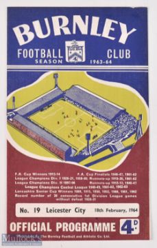1963/64 POSTPONED: Burnley v Leicester City Div. 1 match programme 18 February 1964; good. (1)
