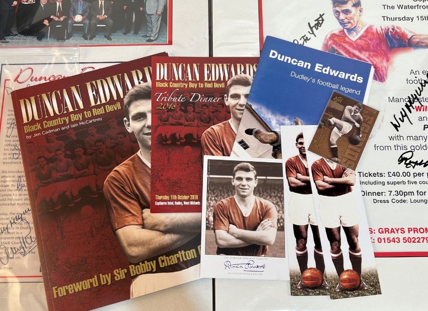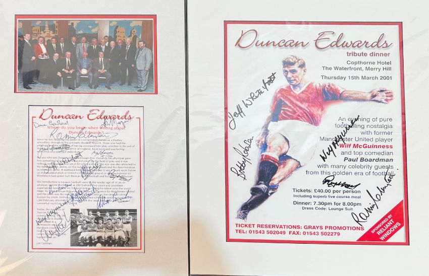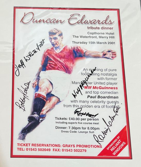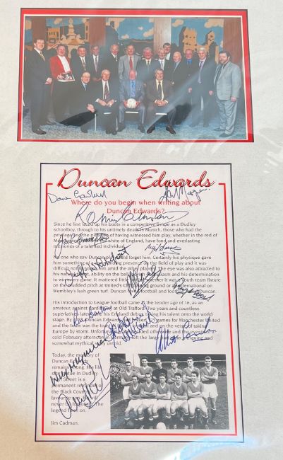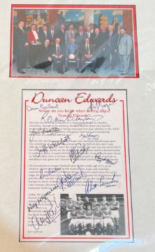 Collection of Duncan Edwards (Manchester Utd) memorabilia to include 2001 Duncan Edwards Tribute Dinner poster 17" x 22" - 15 March 2001 at the Copthorne Hotel, Merry Hill, Wilf McGuinness the main speaker + 5 autographs; Framed tribute to Duncan Edwards (by Jim Cadman) with photographs of the 1958 United team + the former United players association group size 14" x 22.5" + 13 autographs (Kenny Morgans, Dave Gaskell, Jack Crompton, Jeff Whitefoot, Albert Scanlon etc.); A4 size s/b book Duncan Edwards "Black Country boy to Red Devil" 74 pages full of photos, 2018 Duncan Edwards Tribute Dinner menu (& autographs including Tommy Docherty), 2008 Duncan Edwards 50th Anniversary booklet, also Duncan Futera card, Duncan legend card x 2, Duncan Edwards tribute card with printed signature; good/very good. (A Lot)