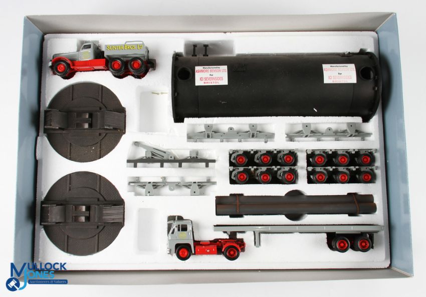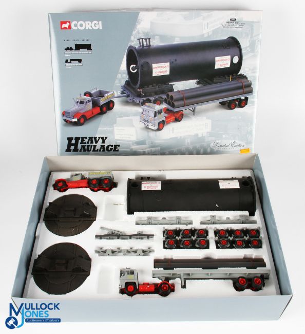 Corgi Heavy Haulage Limited Edition 31014 Sunter Brothers Guy Invincible long platform trailer, pipe load and diamond T ballast, Nicholas Bogies vessel load, boxed