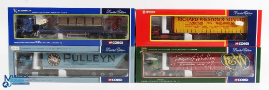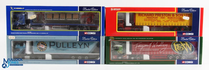 Corgi 1/50 Scale Lorries (4) - CC12005 Man fridge trailer Pulleyn Transport, CC12211 Scania curtainside Fagan & Whalley Ltd, CC12109 Renault flatbed crane trailer & palletised brick load - R T Keedwell Ltd, CC12505 Atkinson borderer tautliner Richard Preston & Son Ltd, all boxed (4)