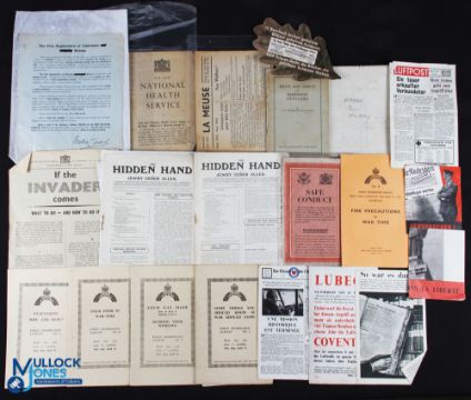 WWII - small group of printed RAF propaganda leaflets dropped over Nazi Germany during WWII, printed in either French or German, together with the printed notice advising on what to do if the German invaders arrive, 1940; a group of public booklets on what to do if war breaks out, fire precautions, gas attack advice etc, 1939, a 'safe conduct' pass for a German soldier who has surrendered, a combat map of Amman in the Middle East and two editions of the British fascist publication 'The Hidden Hand' from 1923