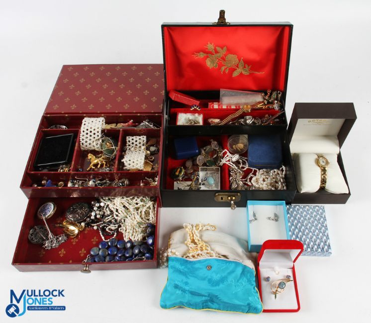 Mixed Selection of Costume Jewellery housed in 2 jewellery boxes with a mixed selection of gem set pieces, silver rose brooch, chains, imitation pearls, loose opal stone, boxed Rotary ladies watch etc (small box)