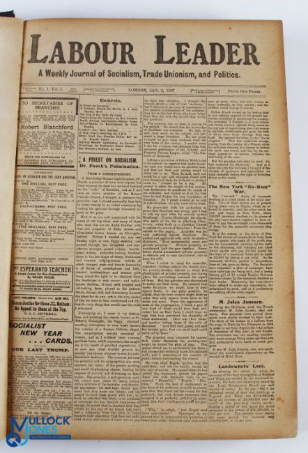 Labour Leader - a weekly Journal of Socialism, Trade Unionism and Politics - Yankee Doodle vol 5 January to December 1908. The Independent Labour Party was founded by Keir Hardy, his paper The Miner, was re-titled Labour Leader, and he made it into a mouthpiece of the movement for a national independent Labour Party. Bound in dark blue cloth, gilt title and date on spine, 17" x 11", in very good condition. A rare survival