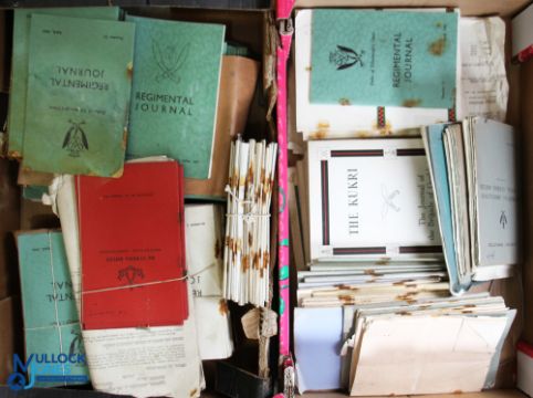 Gurkhas - two cartons containing a considerable archive of editions of the Regimental Journal of the Duke of Edinburgh's Own Regiment of Gurkhas, 1950-1964. Varying condition, some damp affected, but otherwise providing considerable information on the history and operation of the Regiment. Together with a bundle of similar journals for the 6th Queen Elizabeth's Own Gurkha Rifles, 1951-63 and a bundle of cyclostyled newsletters of the Regimental Association of King George V's Own Gurkha Rifles 1950s and 60s, and a considerable number of Regimental Journals from various other Gurkha Regiments. A valuable archive of material relating to the Gurkha Regiments (2 boxes)