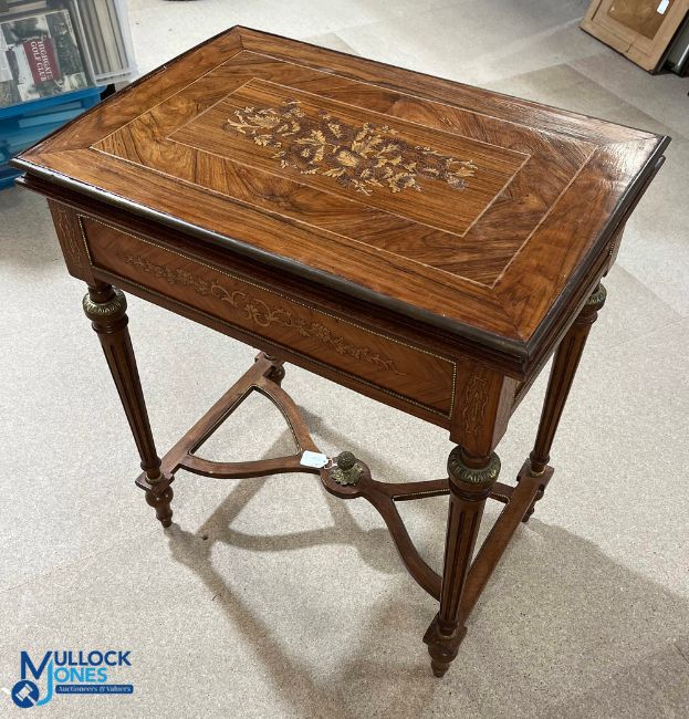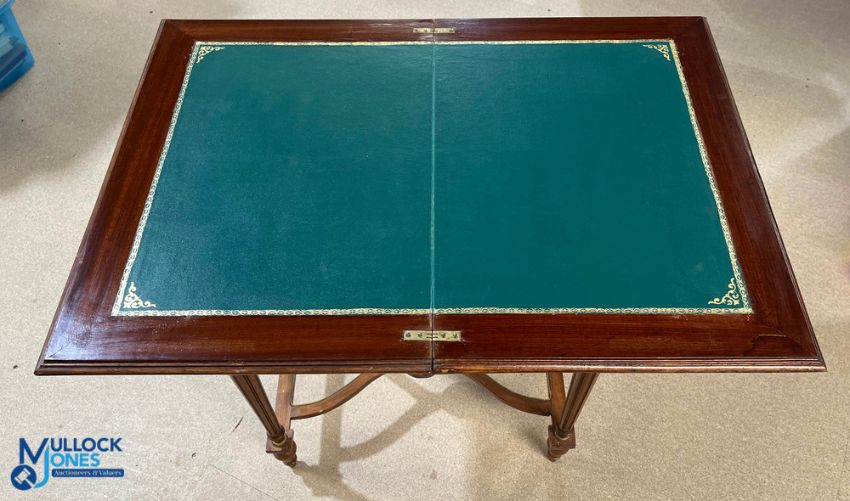 Inlaid Card Table, in Regency style with green leather fold out table, ornated finished legs and stretcher, in need of some TLC - with one loose edge strip. COLLECTION ONLY