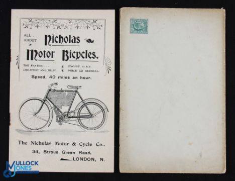 "All About Nicholas Motor Bicycle" Catalogue 1901-02 - 12 page catalogue with 2 illustrations, detailing with specifications and price of 40 Guineas this early Motor Cycle, printed on semi-gloss paper, size 5.25" x 8". Made at their small works in Stroud Green Road, in North London