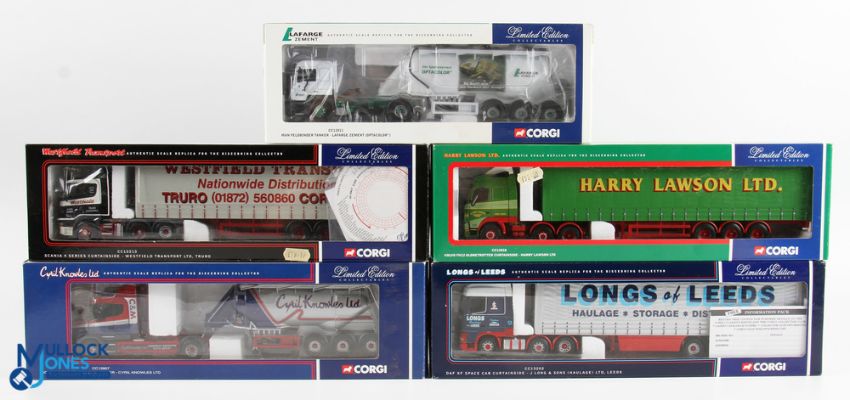 Corgi 1/50 Scale Lorries (5) - CC12011 Man feldbinder tanker Lafarge Zement, CC12418 Volvo FH12 globetrotter curtainside Harry Lawson Ltd, CC12213 Scania 4 series curtainside Westfield Transport Ltd, Truro, CC13202 DAF XF space cab curtainside J Long & Sons Ltd, Leeds, CC12807 Scania T cab feldbinder tanker Cyril Knowles Ltd, all boxed (5)
