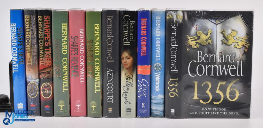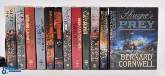 First Editions - Bernard Cornwell (23) - 'Sharpe' novels. Carton of first edition Cornwell books including several 'Sharpe' titles including: Sharpe's Revenge (two copies) Sharpe's Siege (two copies) Sharpe's Havoc, Sharpe's Escape (two copies, one signed by Cornwell), Sharpe's Fury, Sharpe's, Sharpe's Trafalgar (two copies) Sharpe's Prey, Sharpe's Regiment, Sharpe's Rifles, Sharpe's Waterloo, Sharpe's Devil, Sharpe's Battle, Sharpe's Fortress, Sharpe's Tiger, together with 'Azincourt, 'Fallen Angels' 'Crackdown' 'Wildtrack' '1356' and the 2006 pamphlet 'Sharpe's Story'. All in fine condition with djs present (23) 2 boxes