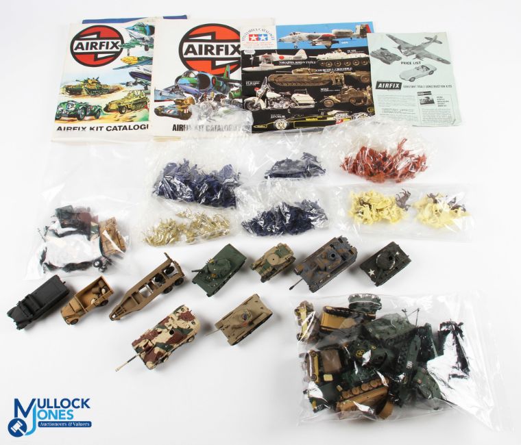 Airfix and Tamiya Scale Figures Catalogues, completed and painted models, with tanks, armoured vehicles, personnel carriers, guns and trailer, plus a selection of 1970s loose unpainted 1:72 figures with noted items of US Calvary x66, Foreign Legion x47, Union Infantry x30, Arabic Figures x21, Cowboys x50, Civil War x57, 1978 Tamya catalogue Airfix 12th, 13th, 14th catalogues, a good selection of mixed items (box of)