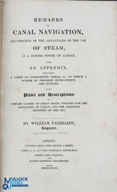 1831 Canals Book - Remarks on Canal Navigation, Illustrative of the Advantages of Steam, as a Moving Power on Canals by William Fairburn, Engineer, printed in 1831, interesting 93 page publication detailing the methods and advantages of steam power on canals for passengers and goods, all fold-out plates are present, well presented in cloth board with half leather spine with fine gilt tooling, 6" x 9"