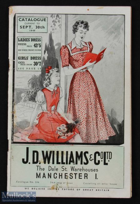 J D Williams & Co Ltd, Dale St, Manchester 1949 Sales Catalogue - interesting Summer Sales 80 page catalogue of Ladies and Children's fashions, also Household Linen, plus a few Gifts (the only things you didn't need Ration Coupons for). Printed on utility paper in very thin pictorial card cover, size 4.75" x 7.5". (Interesting period Catalogue showing what little there was available - ie Only three Prams, only one set of Set of Silver Plated Cutlery, a few Work Shirts for men, reasonable selection of Boots & Shoes)