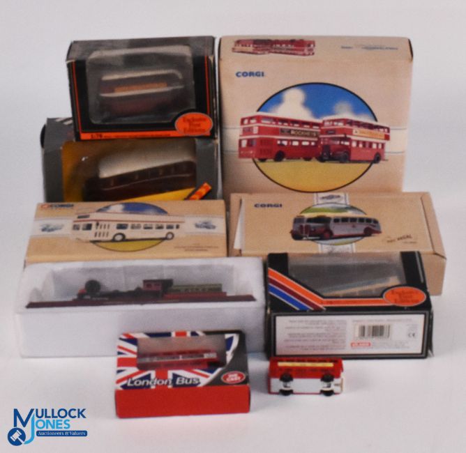 Corgi & Gilbow Bus Coach Collection to include 97233 Leyland Atlantean Open Top Devon Central, AEC Regal Grey cars, Devon general 75th Anniversary, Bedford type OB Coach (box worn), 2 Gilbow models of Devon General plus a static plastic train model