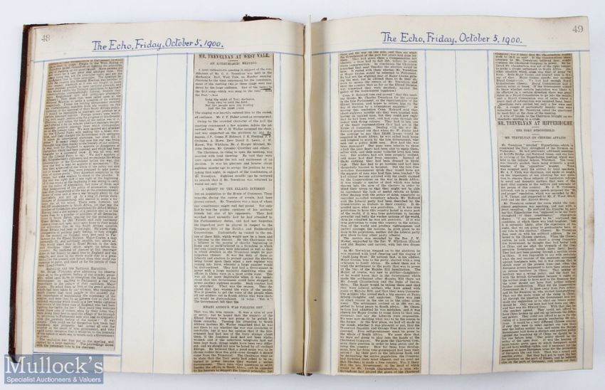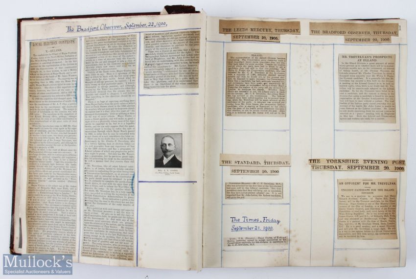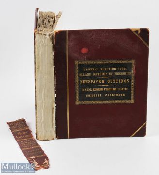 Politics - Leeds - Scrap Album containing mainly press cuttings all relating to the election of Major Edward Feetham Coates, as unionist candidate for the Elland Division of Yorkshire, in the 1900 General Election. Folio, Morocco boards, spine defective but interior contents appear in G condition. A fascinating, comprehensive compilation of contemporaneous newspaper reports that provides an important insight into the way in which politics were conducted at the turn of the century, Coates was defeated by 1,642 votes