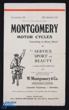 Montgomery Motor Cycles 1930 - fold out to poster size catalogue illustrating and detailing with specification and prices, their 10 machines, ranging from £42 for a 250 cc to £62 for a 750 cc Model. Folds out to size 17.5" x 20"