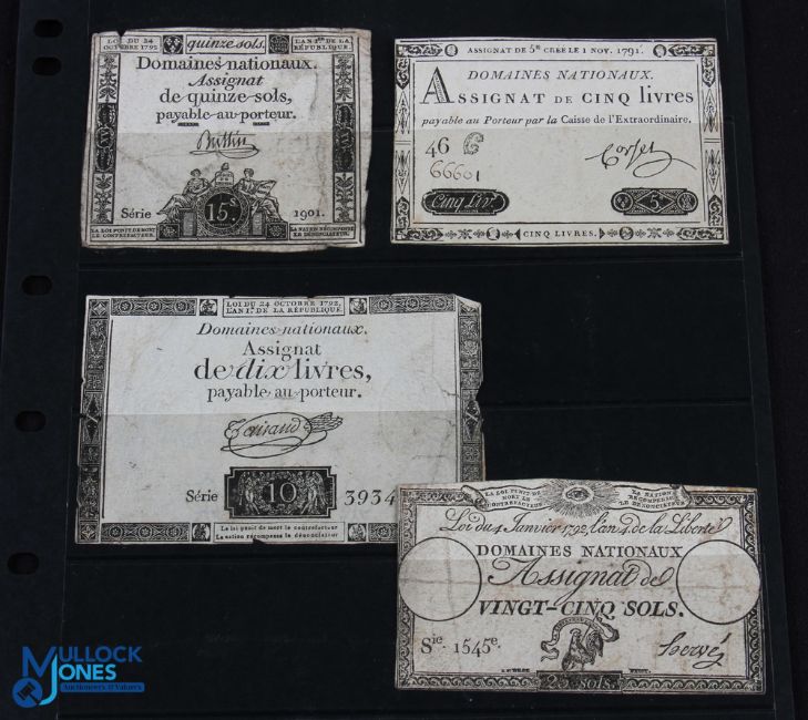 French Revolution - Paper Money 1791/2 - 4 Assignates issued by the Constituent Assembly to address imminent bankruptcy. 1791 15 & 25 sols, 1792 5 & 10 livres (4)