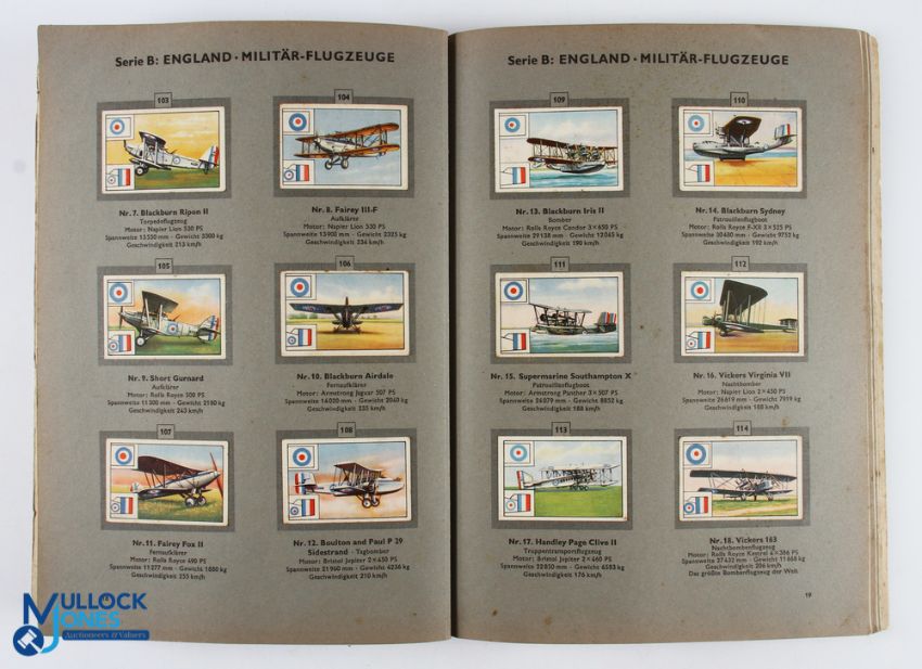 Aviation - 1930s era German sticker book featuring illustrations of the various types of planes being flown throughout the world at the time. Slight creasing to card covers but interior contents good with attractive illustrations