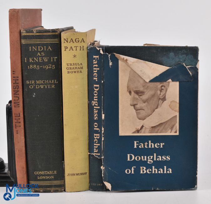 India Books (4) - India as I knew it, by Sir Michael O'Dwyer, 1925 first edition, original cloth boards, good condition. Together with 'The Munshi' - a Standard Hindustani Grammar, fourth edition 1921, (with loosely inserted typescript on 1p folio concerning dialects in the Indian Army) original red cloth boards, good condition, 'Father Douglas of Behala, first edition 1952, a little damp stained, and Nanga Path by Ursula Graham Bower, third edition 1951 (4)