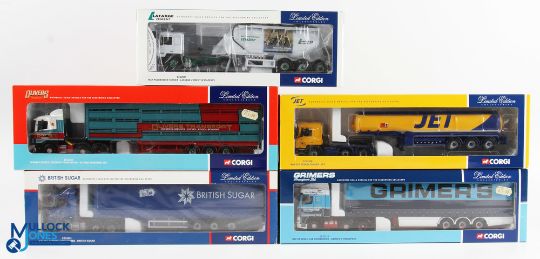 Corgi 1/50 Scale Lorries (5) - CC12009 Man feldbinder tanker Lafarge Zement, CC12708 ERF ECS petrol tanker - Jet, CC12222 Scania 4 Series livestock transporter Olivers Transport Ltd, CC13212 DAF XF space cab curtain side Grimers Transport, CC12221 Scania 4 series curtain side British Sugar, all boxed (5)