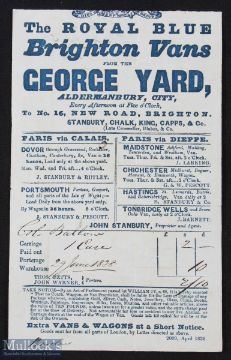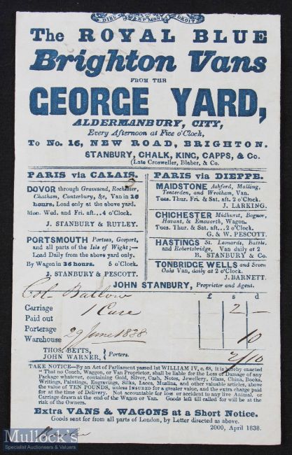 Royal Blue Brighton Vans April 1838 detailed receipt for 2 Shillings and 10 pence paid by Col Ballow for one Case sent by Fast Van from The George Inn, Aldermanbury in the City to Brighton. Blue printing with manuscript annotations, size 4 1/2" x 7"