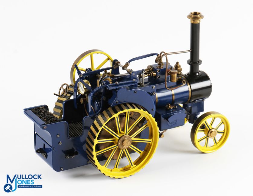D R Mercer (DRM) Birmingham Scale Live Steam Traction Engine finished in blue and yellow, fitted to run on compressed air, with controls to top with gauge, does not include burner for spirit fuel firing, one steering chain needs replacing, length 30cm, height 20.5cm
