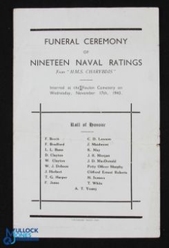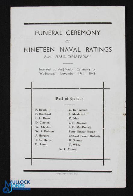 WWII Guernsey 1943 - printed Memento (souvenir) of "Funeral Ceremony of Nineteen Naval Ratings from H.M.S. Charybdis. Interred at Foulton Cemetery on Wednesday November 17th 1943. The first page listing the 19 Names of the Sailors, the other 3 pages with 6 photographs of this crowded event. Printed on War-time slight gloss paper by the Guernsey Press. Folds out to size 11.5" x 9". The Light Cruiser HMS Charybdis was sunk by torpedo in action against German forces with heavy loss of life. Nineteen of the bodies were washed up on beaches in Guernsey, hence this Military Funeral which to the Alarm of the Germans was attended by huge numbers of the Islanders who laid over 900 wreaths