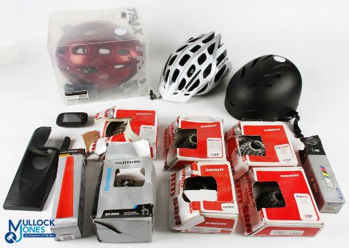 Quantity of Road Mountain Bike Spares to include Sram RD Apex medium gauge, Sram 8 speed 11-32 cassette, 10 speed 11-32 cassette+ 11-36, 7 speed 12-32 cassette, Ritchey Axis 44 Stem, 3 bike helmets Gira Specialized, Trax, and more