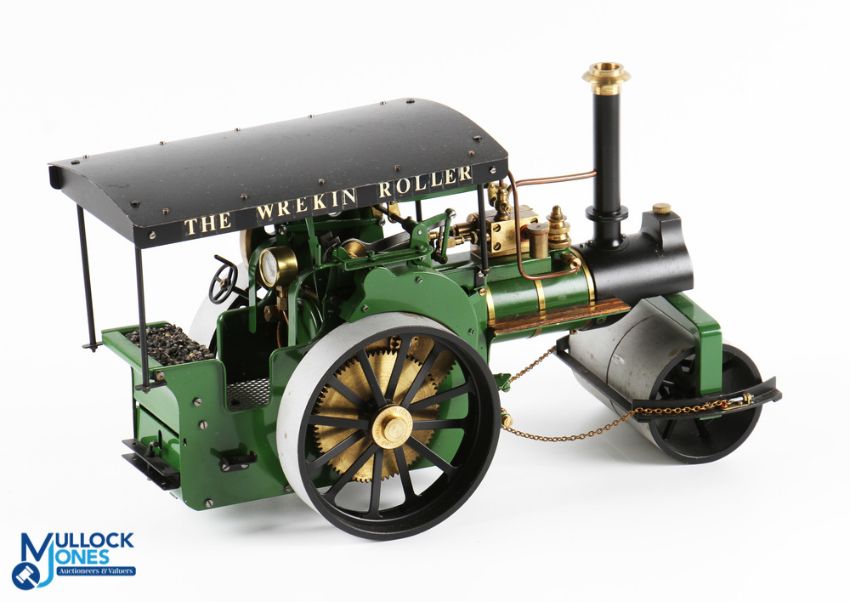 D R Mercer (DRM) Birmingham Scale Live Steam Road Roller finished in green and black with black canopy named to side The Wrekin Roller, fitted to run on compressed air, with controls fitted to top with gauge, does not include burner for spirit fuel firing, length 36cm, height 20cm