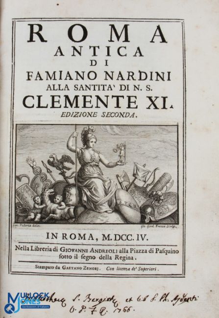 1704 2nd Edition Roma antica di Famiano Nardini alla Santità di N S Clemente XI by Nardini, Famiano Edizione seconda; plus, Memorie di varie antichità trovate in diversi luoghi della città di Roma scritte da Flaminio Vacca nell Anno 1594, full leather-bound book - with signs of age, engraved title page; 3 folding plates and 3 engraved plates in text; 5 folding plates at rear; and numerous illustrations within the text. Italian text.  Has a good Italian book plate to front page