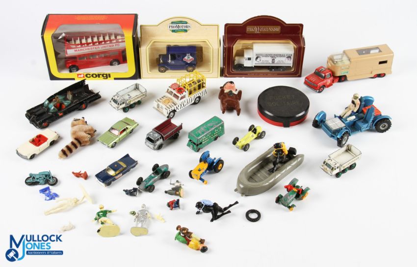 Dinky Corgi, Matchbox, Timpo, Husky Toys a bag of boxed and used toys with noted items of a Corgi Manchester United Bus Timpo boat and divers, Matchbox K-19, Dinky Lunar Rover, Corgi Batmobile, plus more