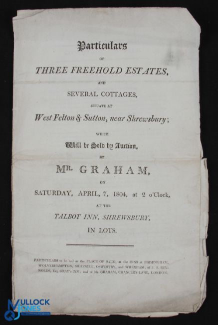 Shropshire - 1804 printed sales particulars for three freehold estates and several cottages at West Felton and Sutton, near Shrewsbury dated April 7th 1804, 5pp folio, letterpress, a little frayed at edges but otherwise fresh and clean and providing a considerable amount of information about the area at the time. Unusual - sales particularly of this early date rarely appear