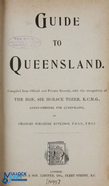 Guide To Queensland - Compiled from Official and Private Records - with the recognition of The Hon. Sir Horace Tozer, KCMG, Agent General for Queensland, by Charles Schafer Rutlidge, 1899, 174 page book with 7 Monochrome Plates. Contents inc progress and range of Natural Resources - Agriculture, Horticulture, Forestry, Pisciculture, &c. - Mineral Wealth - Cities and Towns of Queensland, Their Leading Features, Means of Access, Commercial and Social Conditions. In cloth board binding, size 5.5" x 8.5"