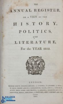 Napoleonic and Peninsula War 1812 - The Annual Register or a View of the history, politics and literature for the year 1812, London 1813, 568pp, reports for General Wellington, Siege of Tariffa, Battles of Ciudad Rodrigo and Badajoz with lists of killed and wounded, naval actions of the French and Spanish Coasts, pp198-241, War with America pp.241-256, Trial of John Bellingham for the Murder of Spencer Perceval, Prime Minister, in the House of Commons pp.304-307, library binding