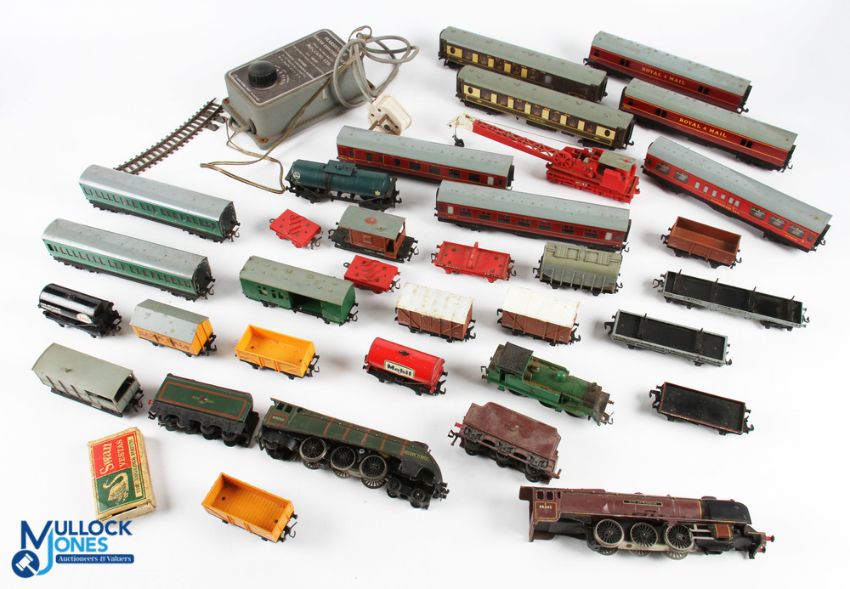 Hornby Dublo Loco and Rolling Stock Selection - inc Golden Fleece and City of London locos and tenders plus a tank loco, all in heavy play worn condition with losses and damages with a selection of mixed rolling stock, coaches, wagons, crane etc, mostly in play worn condition with some better, plus a Meccano power control unit (Box)
