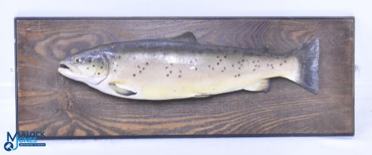 Painted Plaster Cast of a Trout length approx. 51cm, mounted on an oak board, 67cm x 24cm, fish a/f with fin broken / missing with some paint loss to the body