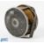 C Farlow & Co Ltd 4.5" brass faced wide drum salmon fly reel and Farlow leather D block reel case (damaged strap) the reel has the Holdfast logo with strapped rim tensioner, A 5226 stamped to the smooth brass foot, xylonite handle, usual age related surface wear
