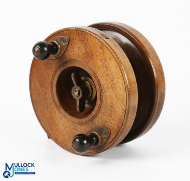 S Allcock of Redditch stamped Wood and brass star back 4.5" reel with brass flange and rear lining, makers stamp to foot, on/off check, central screw sheared off, central wing nut and washers