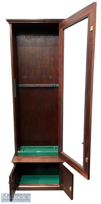 Period Mahogany snooker, pool, billiards cue, fishing rods Storage Cabinet, a fine wooden glazed cabinet made by A G Gange-Harris Somerset, with felt inlay to bottom of cabinet and cupboard section, brass hinges, and escutcheon, comes with keys - size 70cm wide x 40cm deep, and 216 cm tall, in G+ condition. NB COLLECTION ONLY