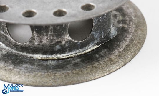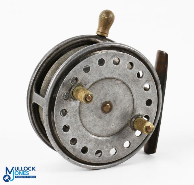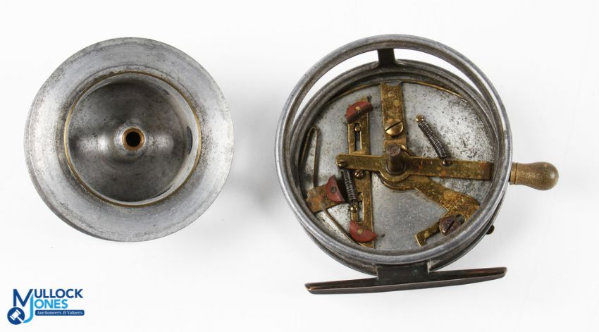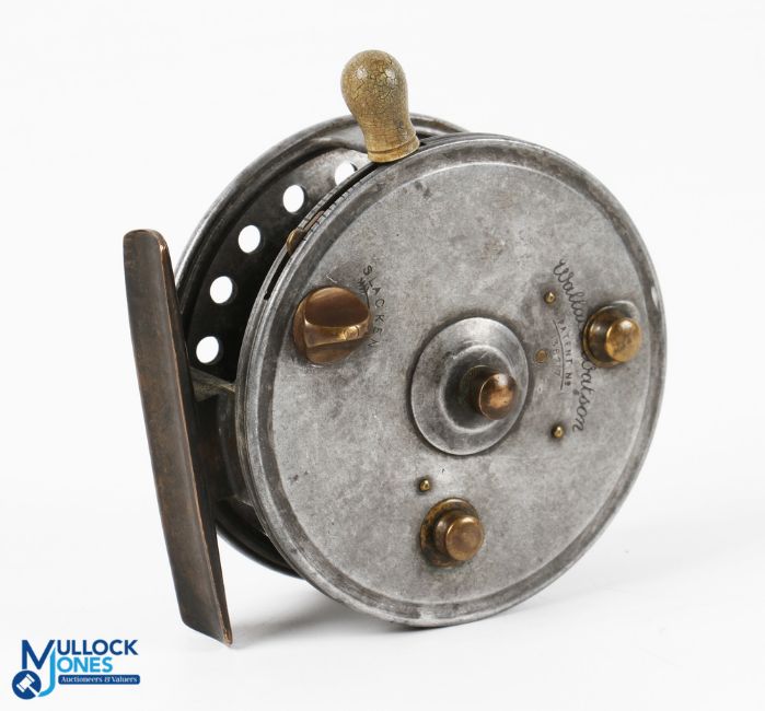 Wallace Watson 4" Patent alloy casting reel in Silex style Pat No136217 - with various tensioners and braking control to rim and rear place, cracked drum flange, perforated drum, twin handle, smooth brass foot, slight sticking when wound, surface wear