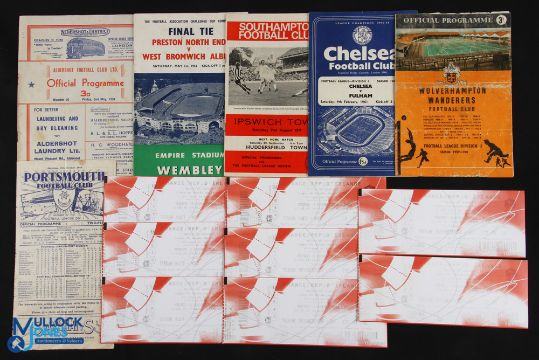 Selection of football programmes to include 1949/50 Portsmouth v Derby County (poor), 1951/52 Aldershot v Wolverhampton Wanderers (Rogers benefit), 1959/60 Wolves v Blackpool (+ 3 match tickets), 1960/61 Chelsea v Fulham, 1971/72 Southampton v Ipswich own, 1954 FAC final West Bromwich Albion v Preston NE at Wembley; Tickets: 2009 France v Republic of Ireland World Cup qualifier 18 November 2009 at Stade de France x 8 tickets; fair. (A Lot)