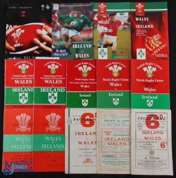 1952-2007 Wales & Ireland Rugby programmes (23): Issues from Swansea (1), Dublin (3) and Cardiff (10) from 1952-55 inc., 59, 81, 83, 85, 87, 89, 91, 93, 95, 96 & 2009, a couple with tickets. Earliest fair/good, the rest G/VG