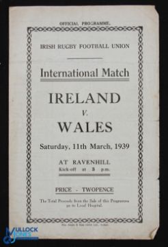 1939 Rare Ireland v Wales Rugby Programme: Ireland 0 v Wales 7, at Ravenhill. Belfast. Last meeting in Ireland pre-WW2. VG