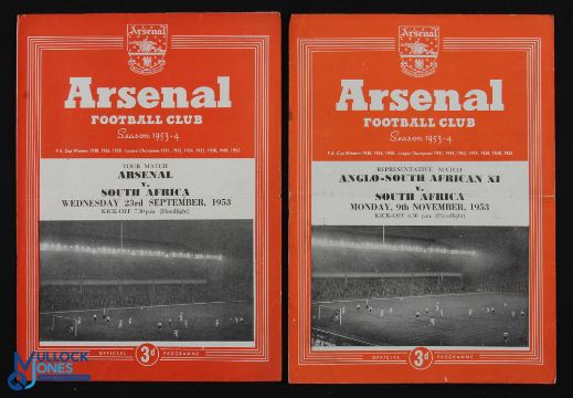 1953/54 Arsenal v South Africa friendly match programme 23 September 1953, 4 pager; 1953/54 Anglo-South African XI v South Africa representative challenge match programme, 9 November 1953, 4 pager; fair. (2)