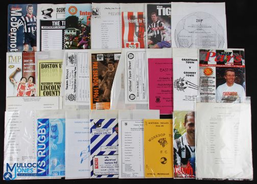 Collection of Grimsby Town home match programmes 1979/80 St Mirren (ss), 1996/97 Leeds Utd, 1997/98 Aberdeen (ss), 1997/98 Hearts (ss), 1998/99 Leicester City (testimonial); aways at 1982/83 Worksop Town (friendly), 1996/97 Scunthorpe Utd (Lincs Snr Cup) x 3, Hartlepool Utd (friendly), Blackpool (friendly), Queen of the South (friendly), East Fife (friendly), Grantham Town (friendly), Dunfermline Athletic (friendly), Gainsborough City (Lincs Snr Cup), 1997/98 Mansfield Town (friendly), VS Rugby (friendly), Darlington (ss) (friendly), Horncastle Town (Vickers Cup), 1998/99 Hull City (friendly), Mansfield Town (friendly), Lincoln City (friendly), Boston Utd (Lincs. County Cup), Isle of Man Football Festival (has single sheet inserts for matches v Isle of Man, Stockport County, Huddersfield Town); fair/good. (27)