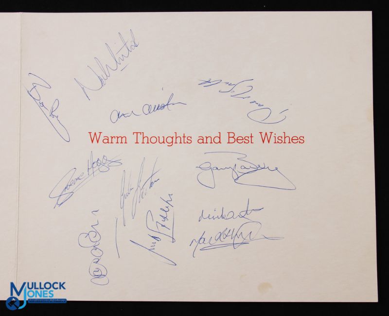 Manchester United official club birthday card greetings issued 1984 to a United supporter with United 1st team player ink signatures: including Gary Bailey, Norman Whiteside, Bryan Robson, Arthur Albiston, Graeme Hogg, Mark Hughes, Gordon Strachan, Paul McGrath, Frank Stapleton, Arnold Muhren plus one other (11); good. (1)