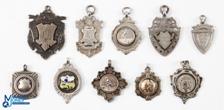 10x Silver and white metal Football League Fobs, a good collection to include 1893 Express Football Challenge Cup, 1922-23 Northleach Hospital Cup with enameled front, 1934 Lucas Sports Club 1922-23 NUWWE Football Shield, 6 fobs have no cup engraving, one is dated 1888, 10 are hallmarked - one marked Sterling and one white metal, 102g in total (10)